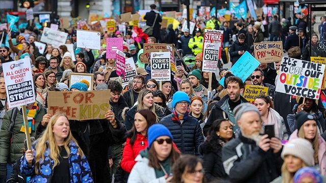 Eğitim görevlilerini temsil eden İngiltere Ulusal Eğitim Sendikasından (NEU) yapılan açıklamada, 2010'dan bu yana en az yüzde 23'lük maaş kesintisi yaşayan 300 binden fazla öğretmenin, çift haneli enflasyon oranının üzerinde bir maaş artışı talebiyle İngiltere genelinde yürüyüş düzenlediği belirtildi.