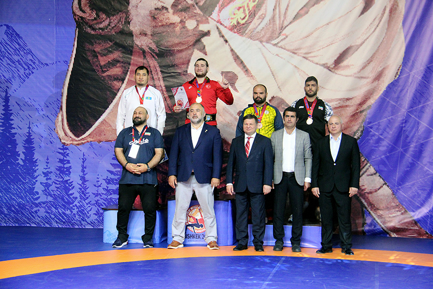 Başkent Bişkek'teki Kabauulu Kojomkul Spor Sarayı'nda düzenlenen organizasyonun 9'uncu ve son gününde büyükler serbest stilde müsabakalar yapıldı.