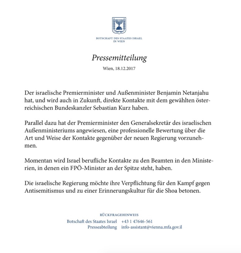 İsrail Viyana Büyükelçiliği tarafından paylaşılan basın açıklamasında; ''İsrail Cumhurbaşkanı ve Dışişleri Bakanı Benjamin Netanyahu bundan sonra Avusturya ile ilgili görüşmeleri sadece ülkenin seçilmiş başbakanı Sebastian Kurz ile yapacaktır.