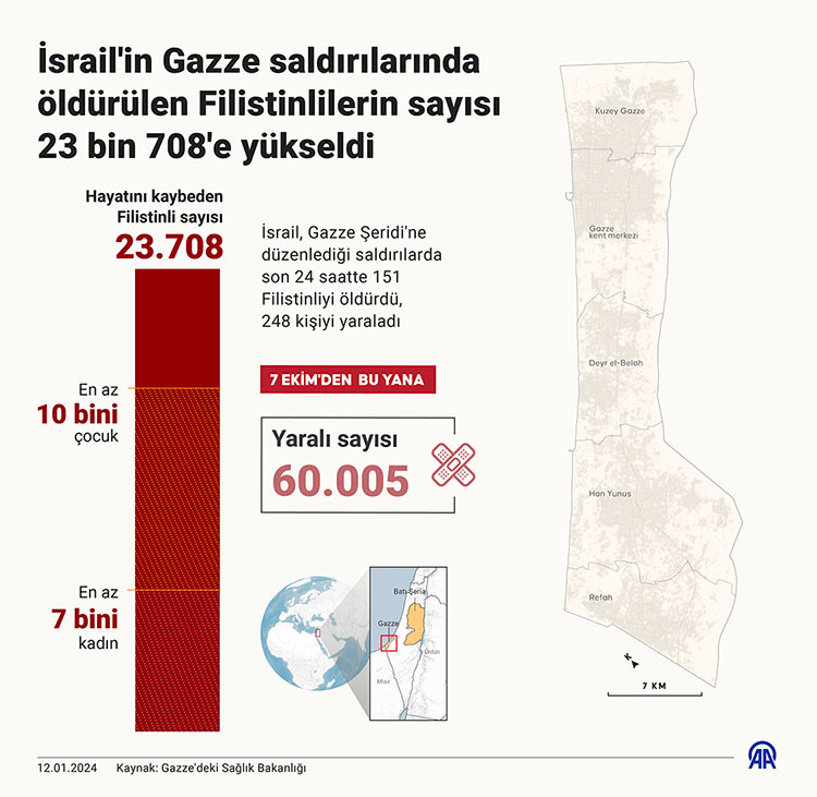 İsrail güçlerinin son 24 saatte "13 katliam" gerçekleştirdiği ifade edilen açıklamada, 7 Ekim'den bu yana düzenlenen saldırılarda öldürülen Filistinlilerin sayısının 23 bin 708'e, yaralananların sayısının ise 60 bin 5'e çıktığı kaydedildi.
