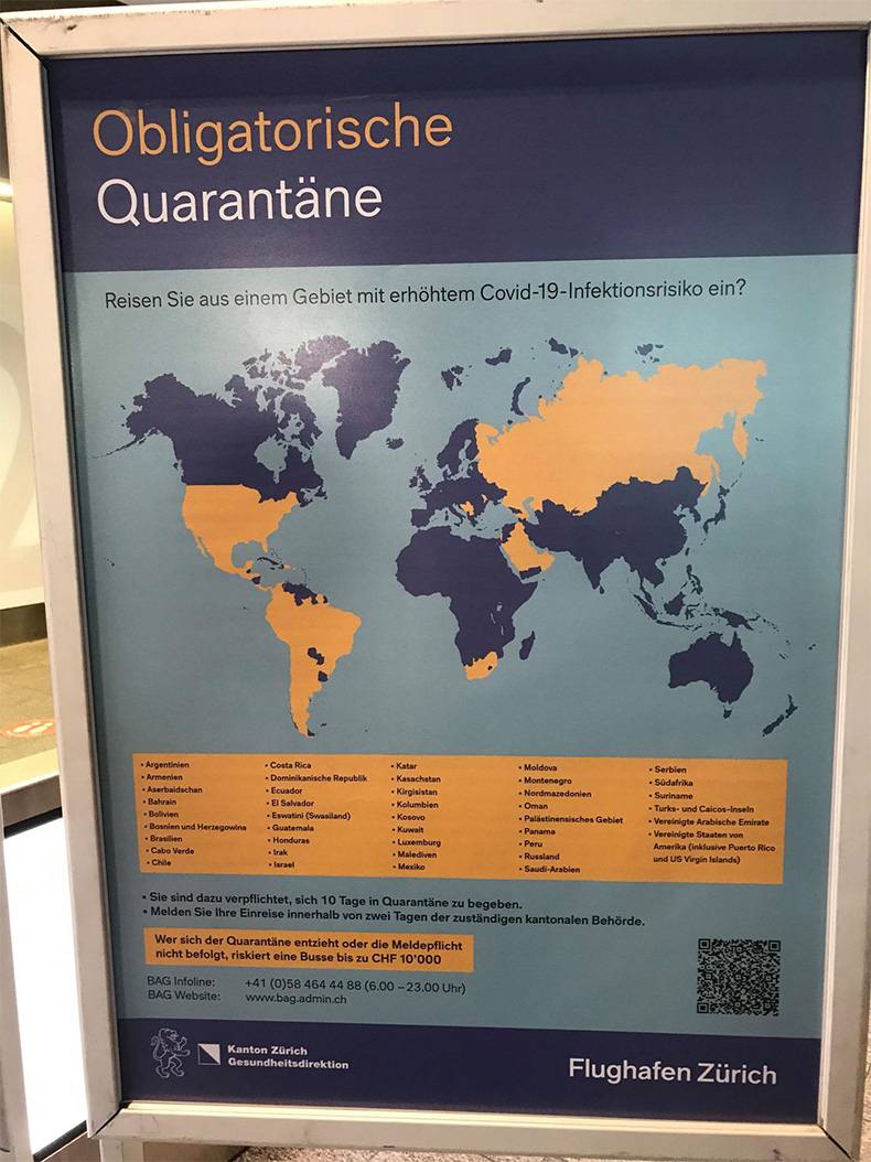 Zürih Havalimanı'nda seyahat edilecek ülkelerdeki karantina durumu hakkında bilgi afişini inceleyenler gözlerine inanamadı. Uydurma bir harita paylaşan İsviçreli yetkililer, haritada Türkiye'ye yer vermedi.