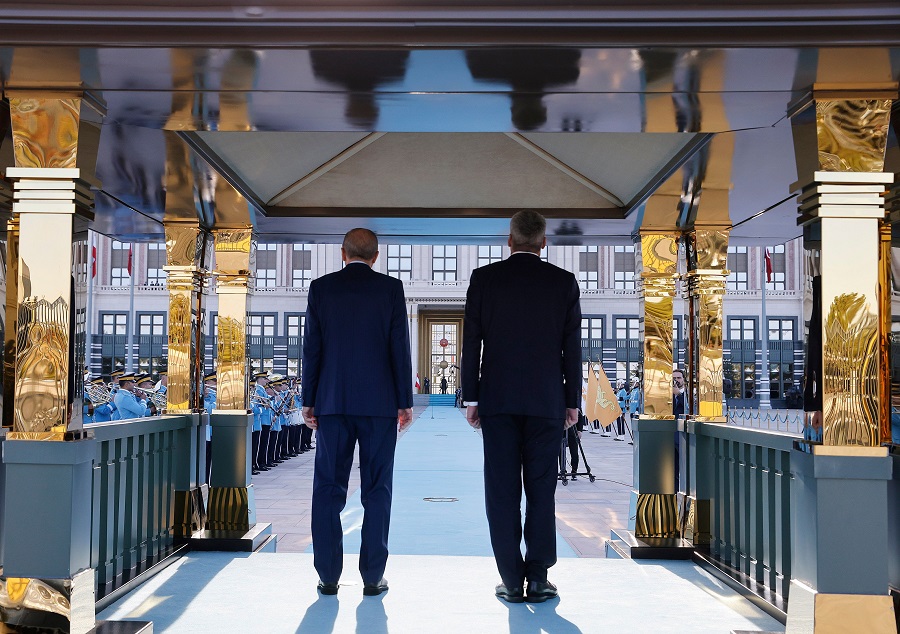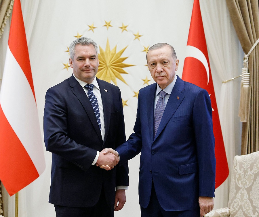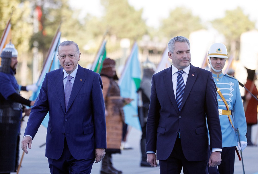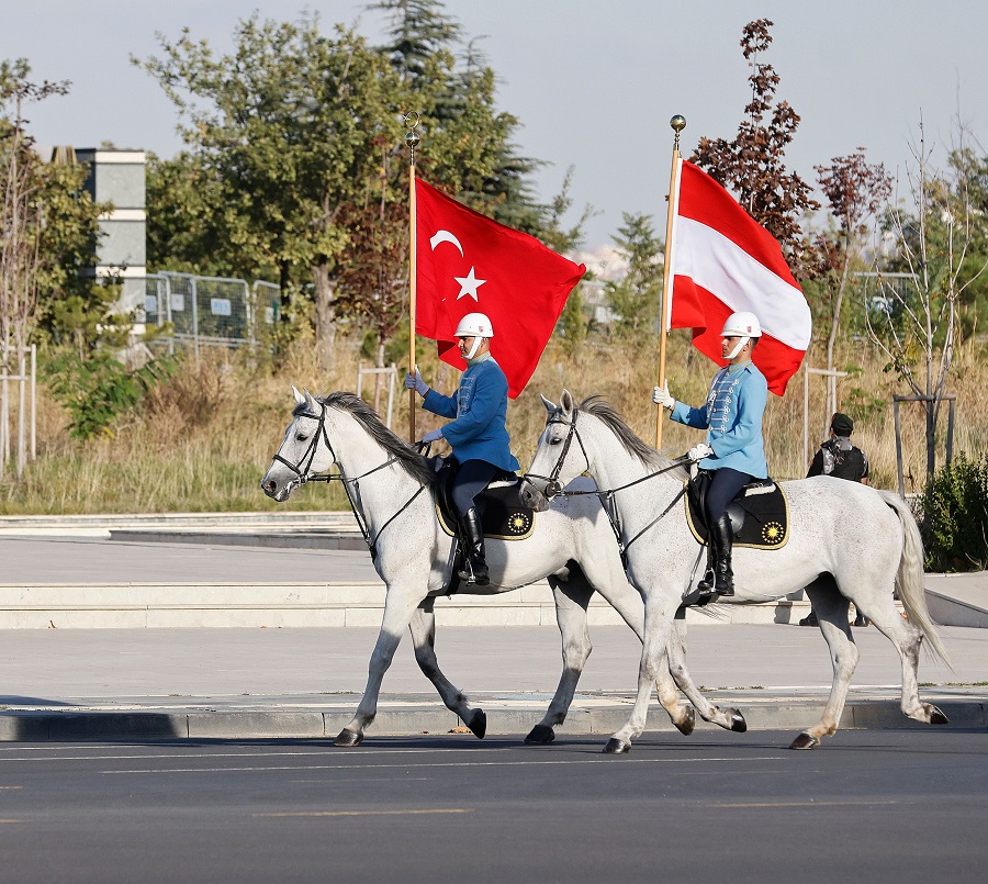 Nehammer, Cumhurbaşkanı Recep Tayyip Erdoğan tarafından Cumhurbaşkanlığı Külliyesi'nde resmi törenle karşılandı.