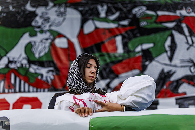 Pankartın yanına, İsrail bombardımanında yaşamını yitiren 20 binden fazla Filistinli çocuğa atıfta bulunan İngilizce bir mesaj yerleştirildi.
