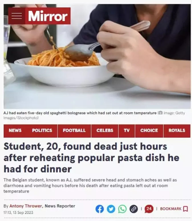 Youtube'da konuya ilişkin bir video yayınlayan Dr Bernard AJ'nin maruz kaldığı durumun nadir görüldüğünü ancak bu konularda temkinli olunması gerektiğini belirterek "Pek çok insan pişirdikleri makarna ya da diğer erişte türlerini ertesi gün yer ve bu bir sorun oluşturmaz. Ancak birkaç saatten fazla dışarıda kalan (oda sıcaklığında bırakılan) yiyeceklere dikkat edin. Eğer yiyecek tuhaf kokuyorsa, üzülmektense tedbirli olmak her zaman daha iyidir." dedi.