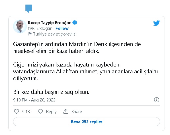 Erdoğan, sosyal medya hesabından yaptığı paylaşımda, "Gaziantep'in ardından Mardin'in Derik ilçesinden de maalesef elim bir kaza haberi aldık. Ciğerimizi yakan kazada hayatını kaybeden vatandaşlarımıza Allah'tan rahmet, yaralananlara acil şifalar diliyorum. Bir kez daha başımız sağ olsun." ifadelerini kullandı.