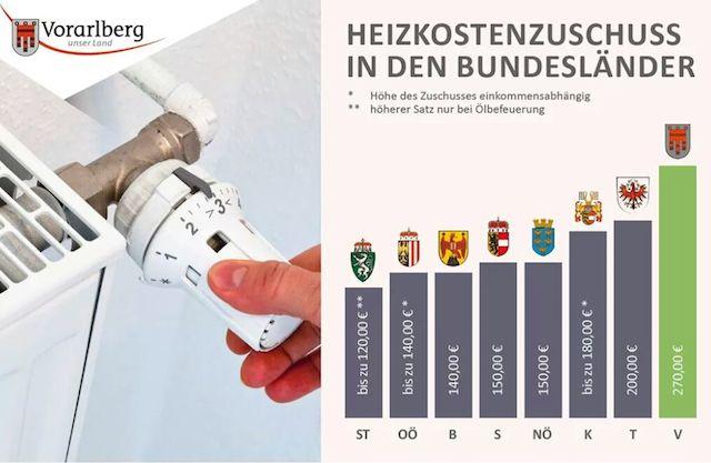 2014/2015 yılı için 250 eurodan, 270 euroya çıkartıldığını kamuoyunla paylaştı. Geçtiğimiz yıl Vorarlberg'de 14.000 hanenin bu yardımdan faydalandığı belirten Eyalet Başkanı Markus Wallner, yapılan bu artışın ÖVP ve Yeşiller koalisyonun ortak çalışması ile gerçekleştiğini belirtirken Avusturya genelinde en fazla artışın yine Vorarlberg'de olduğunu açıkladı.