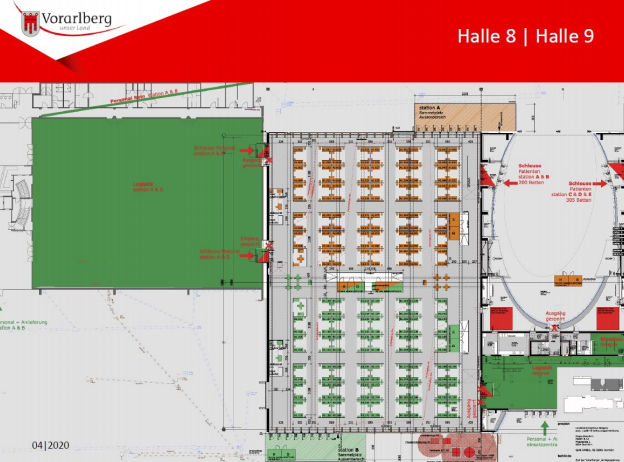 Rüscher, uzmanlarla yapılan bir analizde Messe Dornbirn tesisinin konum olarak en ideal yer olduğu kararına vardıklarını belirtti. Büyük bir alanda tam kapasiteli bir yerin, bir çok küçük alanda daha fazla yerden iyi olduğu kararına vardık. Benzer merkezler, Salzburg ve Viyana gibi diğer eyaletler veya Konstanz Gölü çevresindeki komşu bölgeler tarafından da kurulduğu belirtildi. Eyalet genelinde Covid 19 hastaları için kullanılan 500 yatağın 200'ü artık hastanelerde diğer hastalıklar için tedavi görecek olanlara kapasite olarak kalacak. Rüscher, hastanelerde bulunan 300 Covid-19 yatağının yüzde 70'i işgal edilir edilmez merkezin faaliyete geçeceğini söyledi.