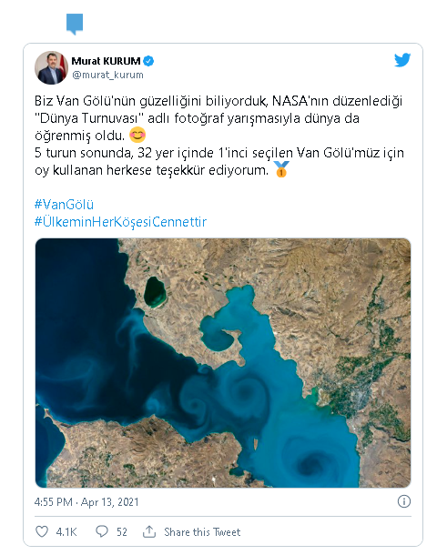 Çevre ve Şehircilik Bakanı Murat Kurum, Twitter hesabındaki paylaşımında, uzaydan çekilen Van Gölü fotoğrafının birinci seçilmesi dolayısıyla oy kullananlara teşekkür etti.