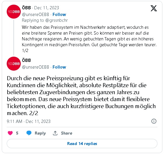 Şaşırtıcı bir şekilde, bu fiyat şoku doğrudan ÖBB tarafından bildirilmedi, ancak İsviçreli demiryolu blog yazarı Timo Grossenbacher ve diğer blogcular tarafından ve X (eski adıyla Twitter) gibi sosyal kanallarda ortaya çıkarıldı. ÖBB sosyal medyadaki paylaşımlara yanıt verdi. "X "te ÖBB, gece taşımacılığı için fiyatlandırma sisteminin uyarlanacağını ve bunun da daha geniş bir fiyat aralığıyla sonuçlanacağını yazdı. ÖBB basın sayfasında henüz herhangi bir açıklama yapılmadı.