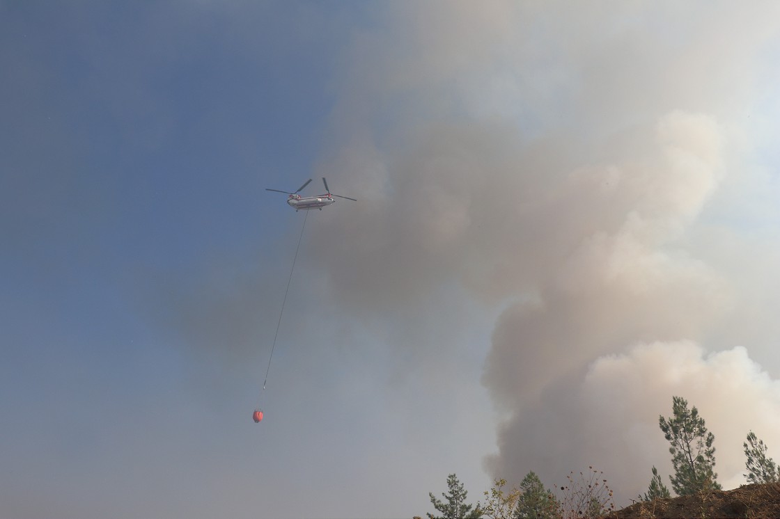 Söndürme helikopterleri de sabahın ilk ışıklarıyla söndürme çalışmalarına havadan destek veriyor.
