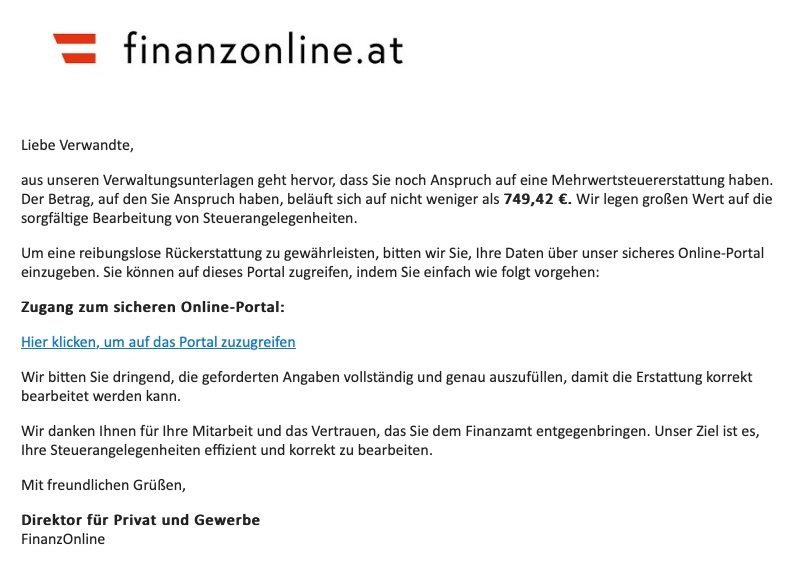 Şu anda Avusturya da ikamet eden bilnlerce kişiye "Vergi makamlarından son hatırlatma" başlığıyla 750 avroluk sözde bir geri ödeme hakkında bilgi veren bir e-posta dolaşıyor. Ayrıca FinanzOnline logosu da kullanılıyor. Mesajda şu ifadeler yer alıyor: