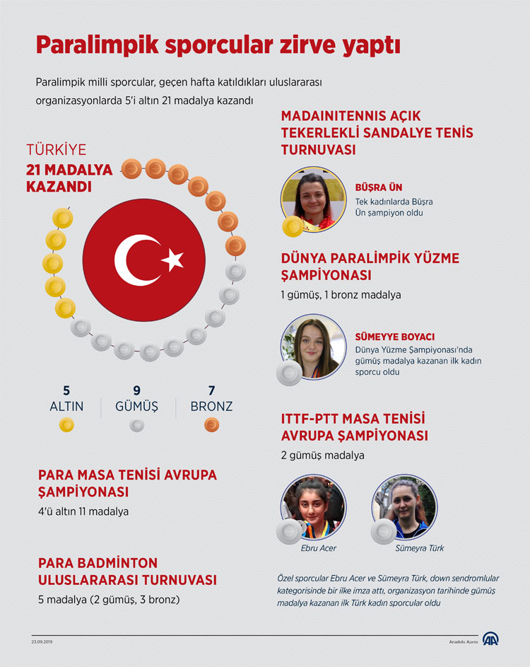 Paralimpik milli sporcular, geçen hafta katıldıkları uluslararası organizasyonlarda 5'i altın 21 madalya kazandı.