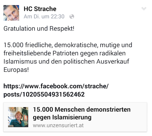FPÖ Genel Başkanı Heinz Christian Strache'de yapmış olduğu paylaşımlarda Pegida'yı Dresden'deki yürüyüşlerden dolayı kutladığını ve bu hareketi desteklediğini açıkladı.