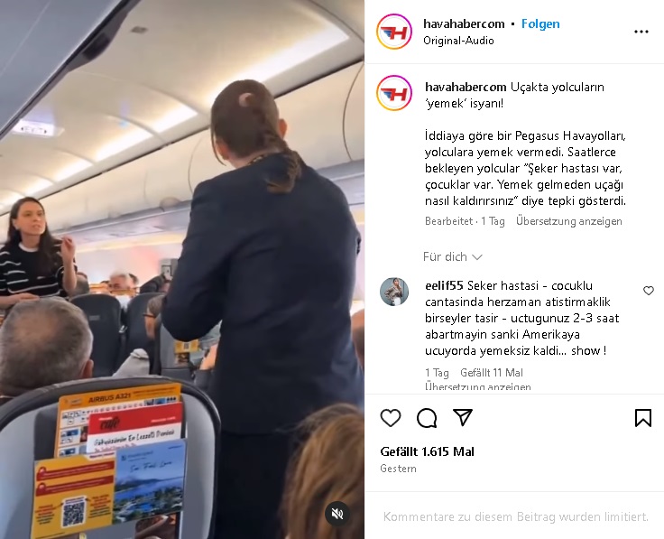 Pegasus firmasına ait tarifeli uçak, iddiaya göre rötar yaptı. Uçak içinde uzun süre bekleyen yolcular ise duruma tepki gösterdi. Bir yolcu, uçaktaki kabin görevlisiyle tartışarak, “Şeker hastası var, çocuklar var. Yemek gelmeden uçağı nasıl kaldırırsınız?” dedi. Yolcular ise kabin görevlisiyle tartışan kadın yolcuyu alkışlayarak destekledi.