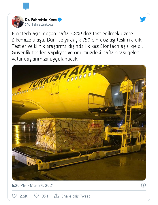 "Bugün ayrıca 700 bin dozdan fazla BioNTech aşısı daha ülkemize ulaştı. Böylece yaklaşık 1.4 milyon doz kullanıma hazır aşı ulaşmış oldu. (Türkiye'ye gelen BioNTech aşısı) Güvenlik testleri yapılıyor ve önümüzdeki hafta sırası gelen vatandaşlarımıza uygulanacak."