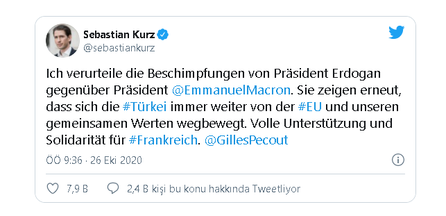 Kurz, Twitter hesabından yaptığı açıklamada, “Cumhurbaşkanı Erdoğan’ın Cumhurbaşkanı Macron’a yönelik hakaretlerini kınıyorum. Bu hakaretleri, Türkiye’nin AB ve ortak dünyalarımızdan giderek daha fazla uzaklaştığını gösteriyor. Fransa’ya tam destek ve dayanışma” ifadesini kullandı.