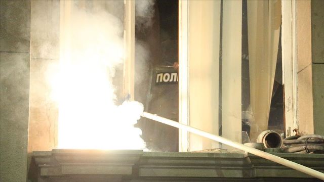 Belediye Meclis binasına meşaleler fırlatan göstericiler, bina kapısını, pencerelerini ve güvenlik kamerasını kırdı.