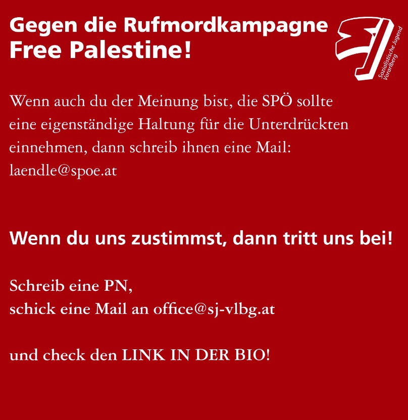 SJ Vorarlberg, Hamas saldırısının ardından İsrail'in Gazze Şeridi'ndeki tüm Filistin nüfusuna karşı acımasız bir savaş yürüttüğünü paylaştı. SPÖ Gençlik örgütü yaptığı paylaşım ile Filistin halkıyla dayanışma içinde olduğunu açıkça ifade etti.