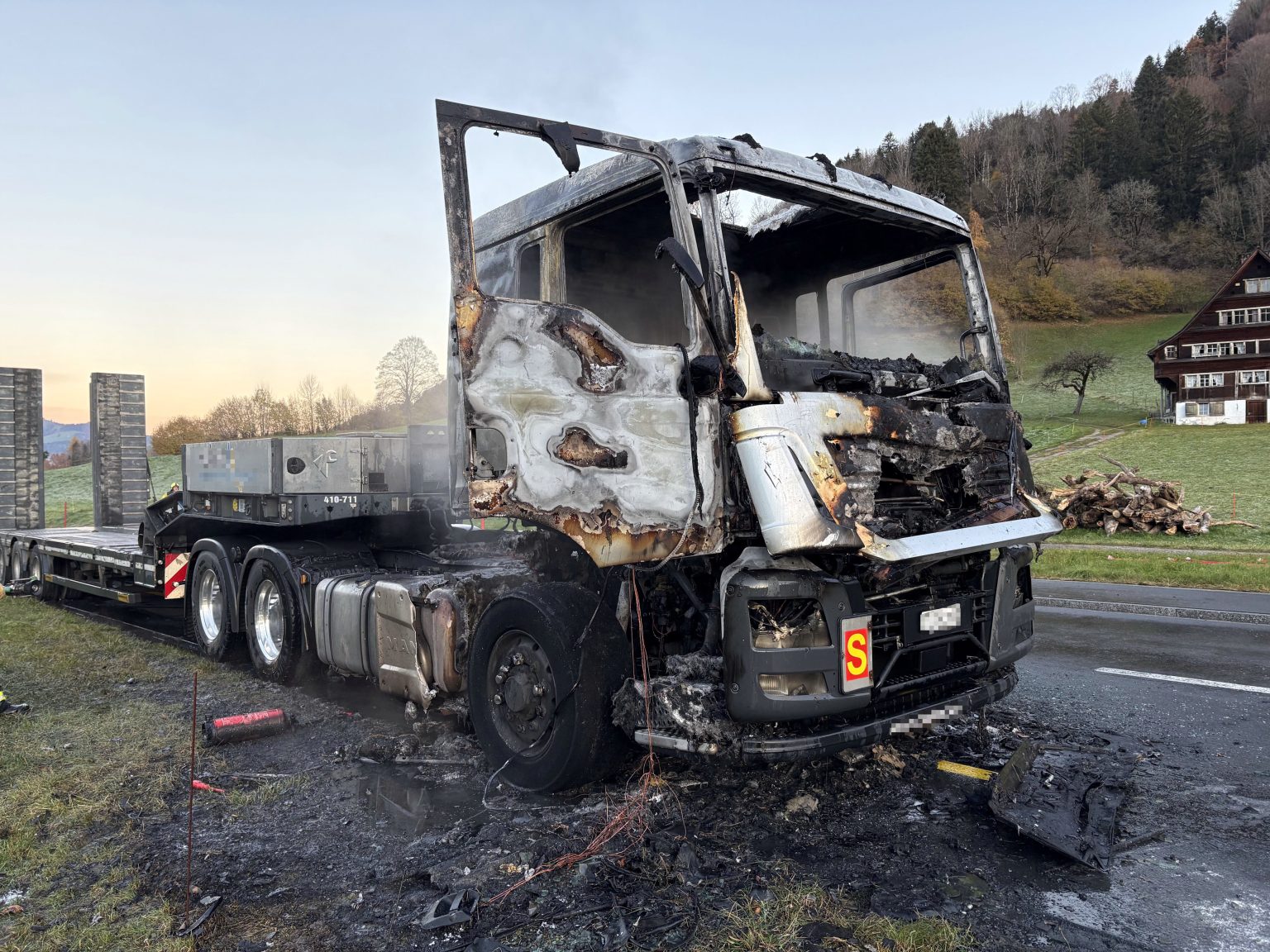 İsviçre’nin St. Gallen Kantonu’nda, Ebnat-Kappel çevre yolunda Cuma sabahı bir kamyon tamamen yanarak kullanılamaz hâle geldi. Yangın söndürülse de, dizel yakıtı ve söndürme suyu toprağa karıştığı için çevre alarmı verildi.