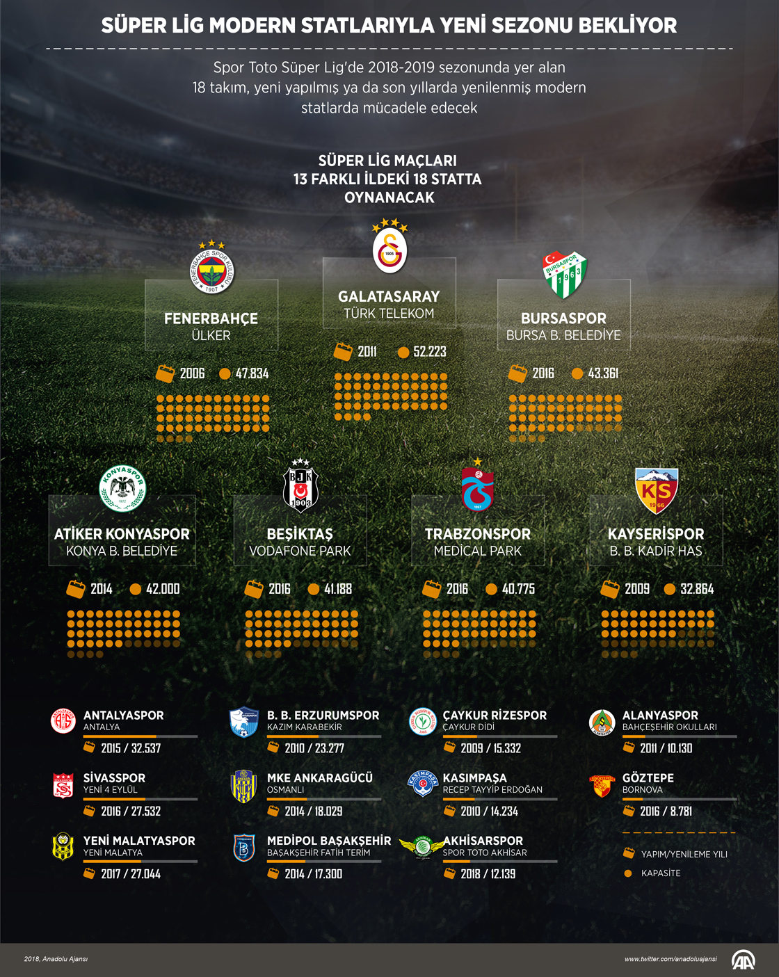 Türkiye'de son yıllarda gerçekleştirilen tesisleşme hamlesinin ardından Süper Lig maçlarının büyük çoğunluğu, 2009 yılı sonrasında açılan veya son 12 yılda yenilenen statlarda oynanacak.