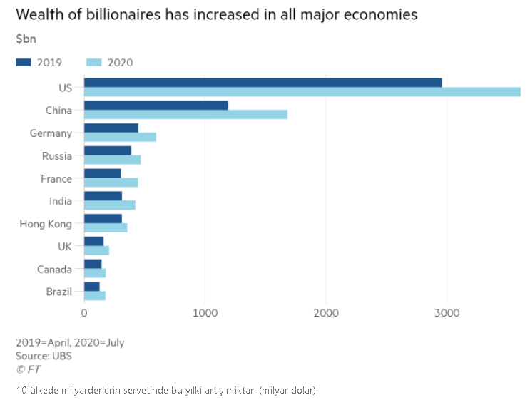Örneğin, dünyanın en zengin ismi olan Amazon’un patronu Jeff Bezos’un serveti, pandeminin etkili olduğu mart ortası ile eylül ortası arasında tam 73 milyar dolar arttı.