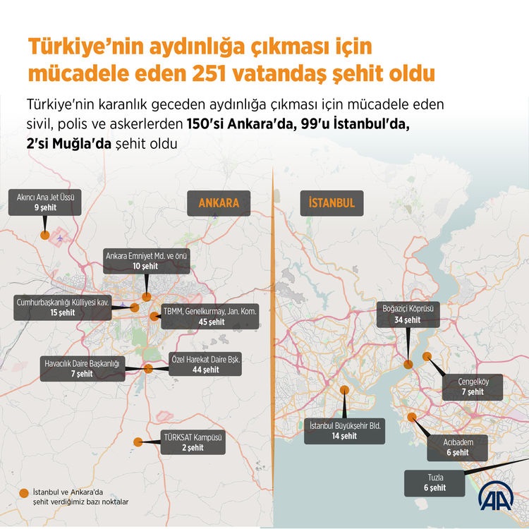 Türkiye'nin, o karanlık gecede aydınlığa çıkması için mücadele eden sivil, polis ve askerlerden 150'si Ankara'da, 99'u İstanbul'da, 2'si Muğla'da şehit oldu.