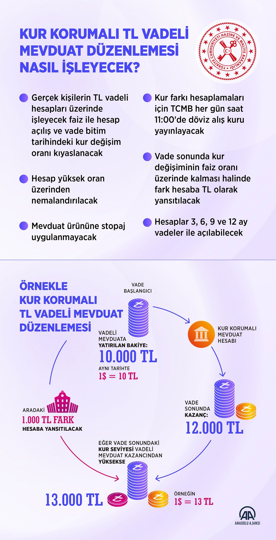 "Hesaplar 3, 6 ve 12 ay vadeli olarak açılabilecektir. Açılacak Türk lirası vadeli hesaplara işleyecek faiz/kâr payı ile hesap açılışı ve vade sonundaki kur değişim oranı kıyaslanarak yüksek olan oran üzerinden mevduat ve katılım fonu sahibine ödeme yapılacaktır. Hesap açılışındaki kur ile vade sonu kurunun ne olduğuna bakılmaksızın anapara ve faiz/kâr payı tutarı müşteriye banka tarafından ödenecektir. Vade sonu kuru üzerinden hesaplanacak tutar, anapara ve faiz/kâr payı tutarından büyükse; aradaki fark TCMB tarafından karşılanacaktır. Vadeden önce hesaptan para çekilmesi durumunda destekten faydalanılamayacaktır."