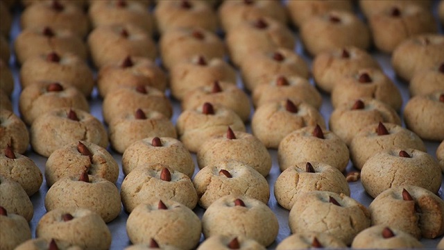 Tepsiye dizilen kurabiyeler, üzerine tekrar kayısı çekirdeği serpildikten sonra fırında pişiriliyor.