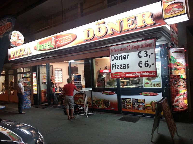 Müşterilerinin çoğu Avusturya'lı yerel müşterilerden oluşan ve Pizza-Kebab-Grill Haus olarak hizmet veren Today's İmbiss'in önünde müşterileri için park yeri bulunurken, İmbiss'e gelen müşteriler park problemi de yaşamıyor.
