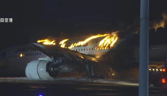 Japonya devlet televizyonu NHK'nin yayınladığı görüntülerde, uçağın pencerelerinden çıkan alevler kaydedildi.