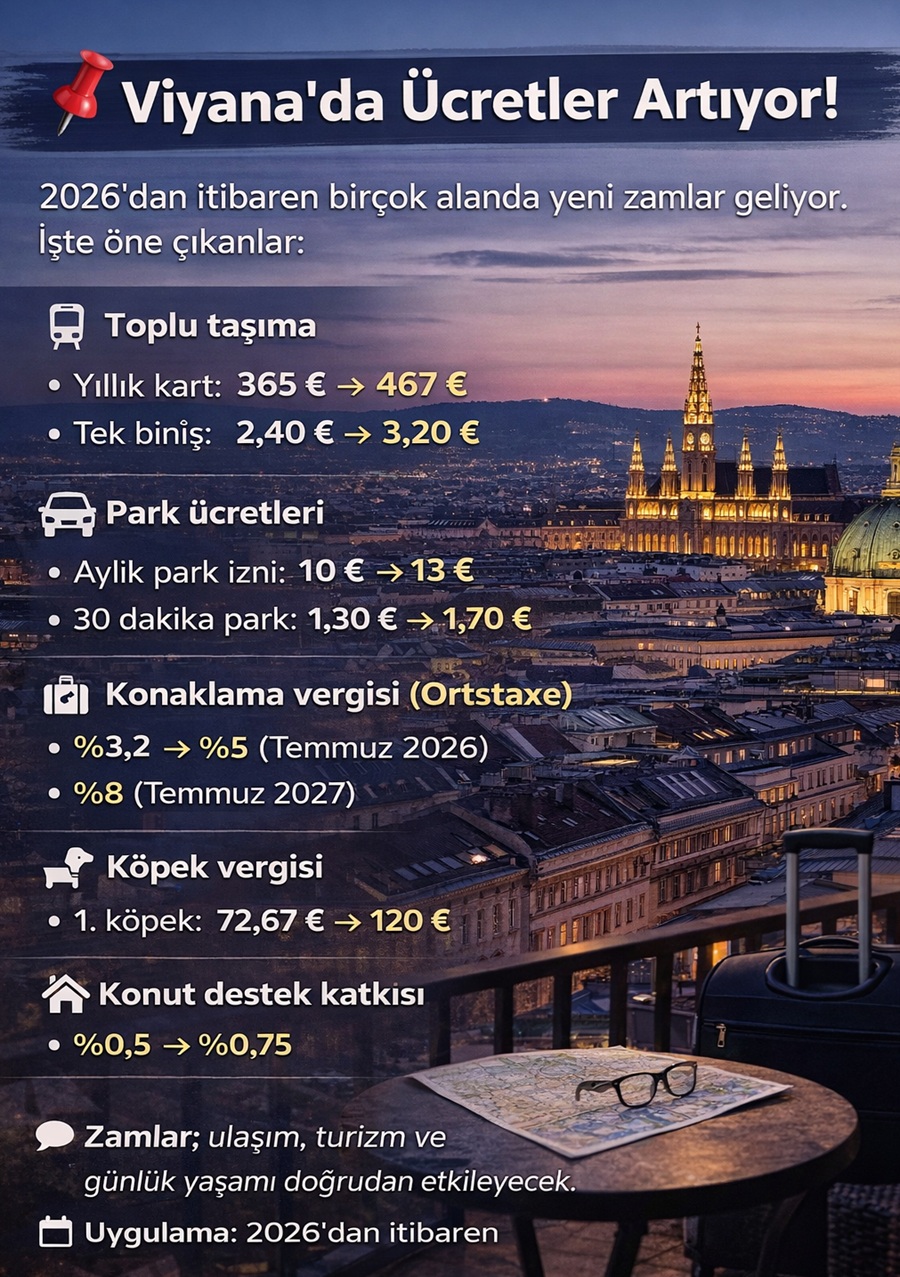 Viyana bu konuda yalnız değil. Innsbruck, 2025 ortasında konaklama vergisini gecelik 3 avroya yükseltti. Kentte Mayıs 2026 itibarıyla bu tutarın 4 avroya çıkarılması planlanıyor. Böylece Avusturya’nın önemli turizm merkezlerinde konaklama maliyetleri kademeli olarak artmış olacak.