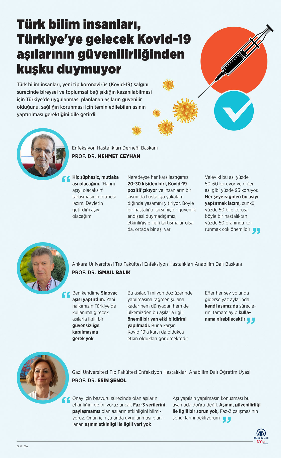 Türk bilim insanları, küresel yeni tip koronavirüs (Kovid-19) salgını sürecinde sağlığın korunmasında doğru bilgiye erişimin önemine dikkat çekerek, geliştirilen aşılara karşı ön yargılı olunmaması, Sağlık Bakanlığı ve Bilim Kurulu ile alanında uzmanı hekimlerin verdiği bilginin referans alınması gerektiğini bildirdi.