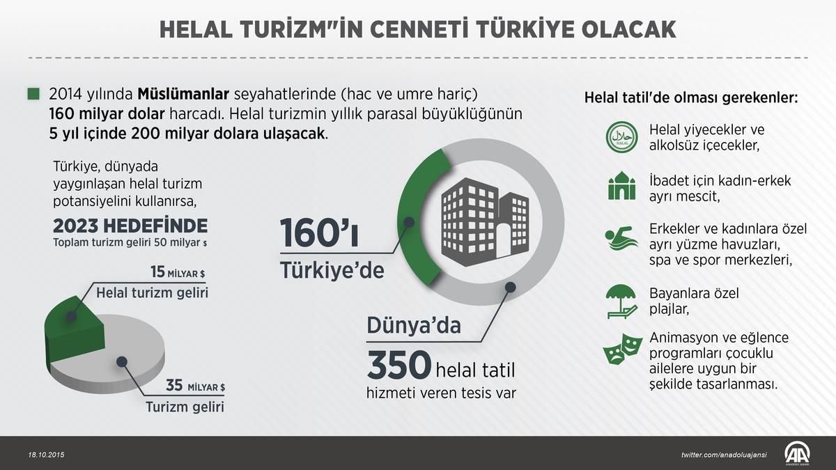 "Uluslararası araştırma şirketi Crescent Rating’in yaptığı araştırmaya göre, geçen yıl Müslümanlar seyahatlerinde (hac ve umre hariç) 160 milyar dolar harcamış. Araştırmada Müslümanların yüzde 51’i helal turizm olanaklarını kullanmak istediklerini belirtmiş. Dünya turizm endüstrisinin yıllık hacmi 1 trilyon 100 milyar dolar. Müslüman turist potansiyeli turizm endüstrisinin yüzde 15’ini kapsamaktadır. Bu oranın yüzde 51’lik kısmının helal turizm alıcısı olduğunu varsayarak, helal turizm pazarının 2014'de turizm endüstrisinin yaklaşık yüzde 7,5’luk payını oluşturduğunu söyleyebiliriz. Bu da yaklaşık 82 milyar dolarlık bir pazar."
