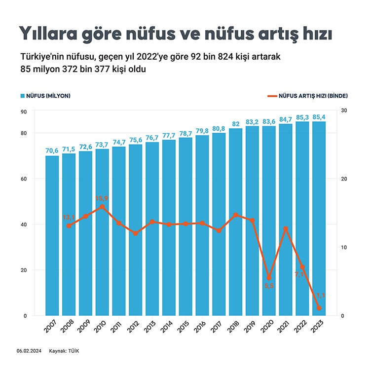 Buna göre, 2022 yılı itibarıyla 85 milyon 279 bin 553 olan ülke nüfusu geçen yıl 92 bin 824 kişi artarak 85 milyon 372 bin 377 kişi oldu.