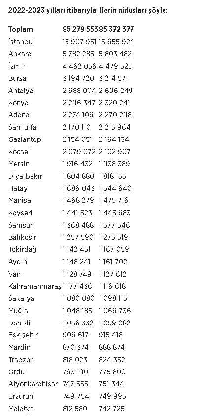 İstanbul'un nüfusu, bir önceki yıla kıyasla 252 bin 27 kişi düşerek 15 milyon 655 bin 924 kişiye geriledi. Türkiye nüfusunun yüzde 18,34'ünün ikamet ettiği İstanbul'u, 5 milyon 803 bin 482 kişiyle Ankara, 4 milyon 479 bin 525 kişiyle İzmir, 3 milyon 214 bin 571 kişiyle Bursa ve 2 milyon 696 bin 249 kişiyle Antalya izledi.