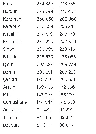 Bayburt, 86 bin 47 kişiyle en az nüfusa sahip il oldu. Bu ili, 89 bin 317 kişiyle Tunceli, 92 bin 819 kişiyle Ardahan, 148 bin 539 kişiyle Gümüşhane ve 155 bin 179 kişiyle Kilis takip etti.