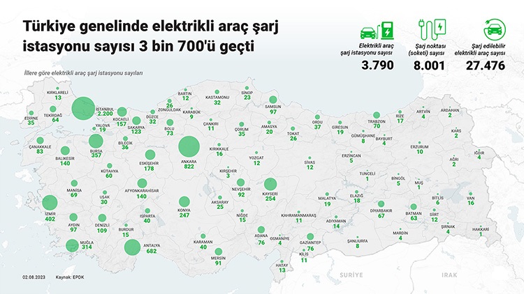 Türkiye genelinde 5 bin 614 istasyonda elektrikli araç kullanıcılarına 8 bin 492 yavaş şarj (AC) ve 3 bin 575 hızlı şarj (DC) hizmeti veriliyor.