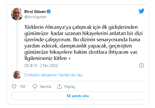 Birol Güven, Türklerin Almanya’ya çalışmak için ilk gidişlerinden günümüze uzanan hikayelerini dizi yapıyor. Ancak Güven, senaryoda kendisine danışmanlık yapacak kişiyi takipçilerinden arıyor.