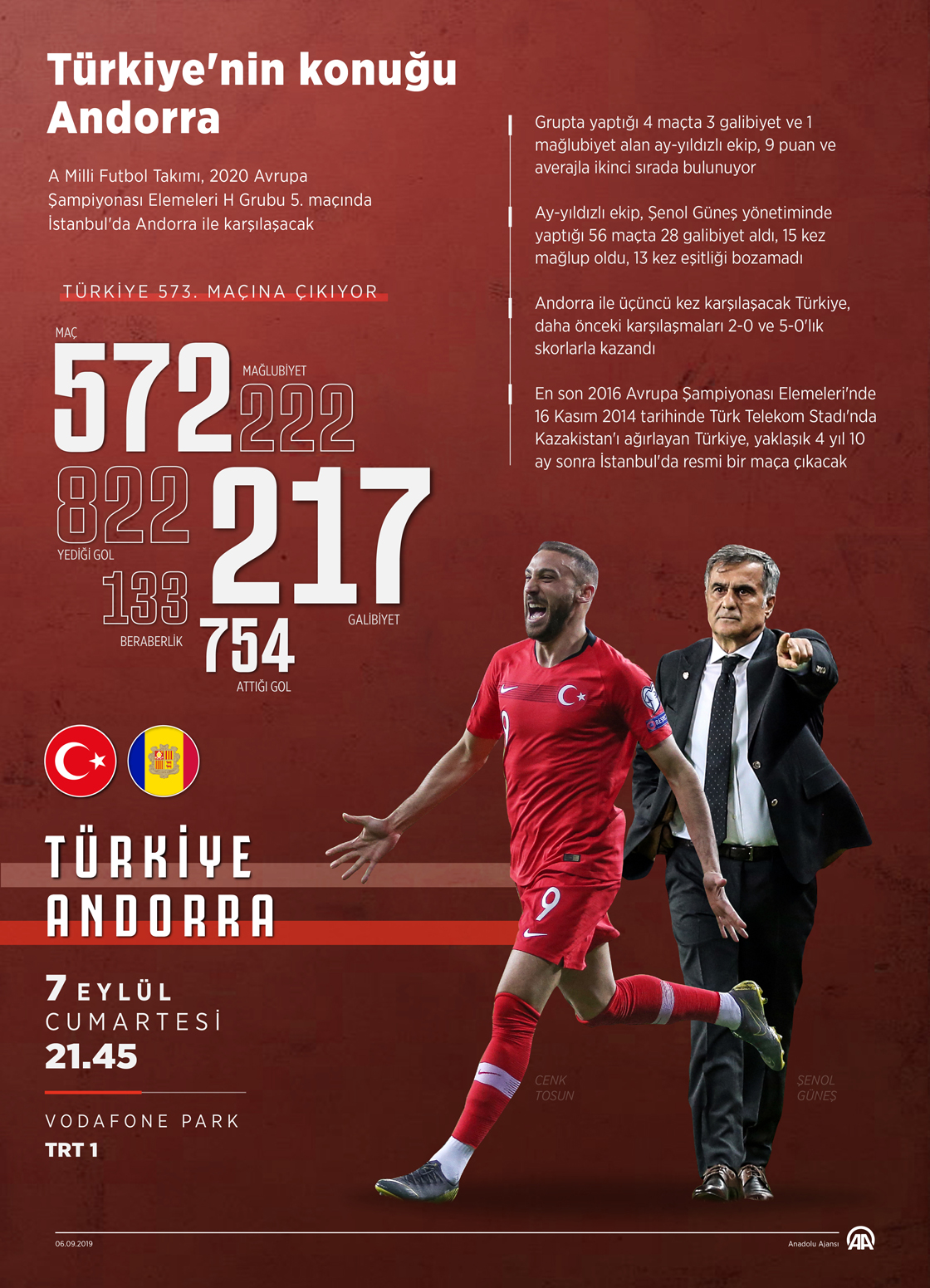 A Milli Futbol Takımı, 2020 Avrupa Şampiyonası (EURO 2020) Elemeleri H Grubu 5. maçında sahasında Andorra ile karşı karşıya gelecek.