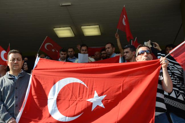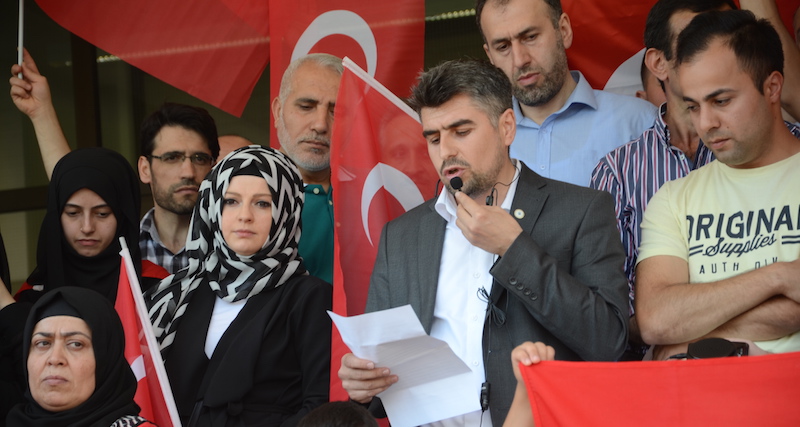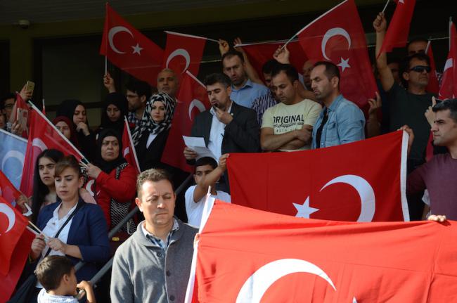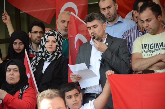 Wir haben uns hier heute als türkischstämmige Menschen, als türkische Bürger sowie Freundinnen und Freunde der Türkei versammelt, um für das demokratische Selbstbestimmungsrecht, die Freiheit und die Unabhängigkeit der Türkei einzustehen und den von 52 Prozent des türkischen Volkes gewählten Präsidenten weiterhin zu unterstützen.