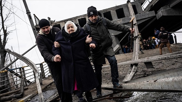 Ukrayna’nın başkenti Kiev yakınında yer alan ve ulaşım altyapısının tamamen tahrip edildiği İrpin kentinde son günlerde Rus hava saldırısının yoğunlaşmasıyla siviller kendi imkanlarıyla kentten ayrılıyor.
