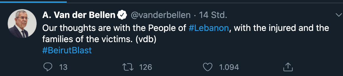 Avusturya Cumhurbaşkanı Alexander Van der Bellen, sosyal medya hesabından patlamaya ilişkin taziye mesajı paylaştı. Van der Bellen, "Düşüncelerimiz Lübnan halkı, olayda yaralananlar ve hayatını kaybedenlerin aileleriyle." ifadesini kullandı.