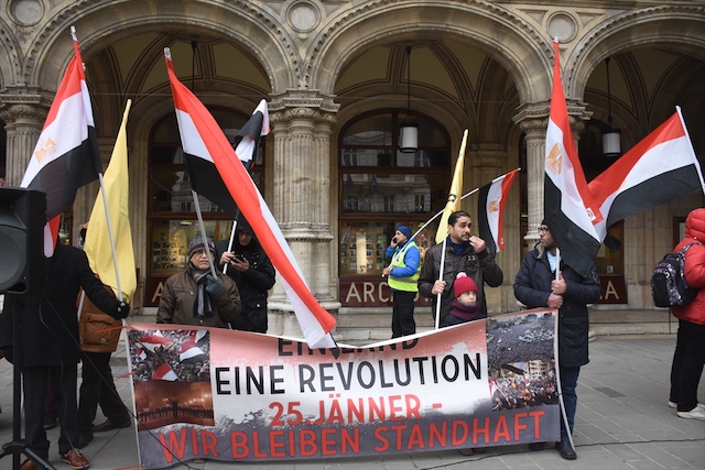 Avusturya'nın başkenti Viyana'da bir grup, 25 Ocak 2011'de Mısır’da gerçekleştirilen devrimin yıl dönümünde, ülkede askeri darbe ile yönetimi ele geçiren Cumhurbaşkanı Abdulfettah es-Sisi’yi protesto etti.