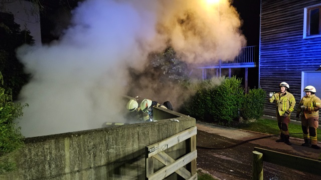 İlk yangın, saat 01.30 sıralarında Neudorfstraße üzerinde çıktı. Bir kâğıt atık konteyneri tamamen alev aldı, yangın kısa sürede hemen yanındaki bir bahçe çitine de sıçradı. Yangına müdahale eden 10 kişilik Wolfurt itfaiye ekibi, alevleri hızlıca kontrol altına aldı. Konteyner ve çit tamamen zarar görürken, yakınlardaki konut binasında herhangi bir hasar oluşmadı, kimse yaralanmadı.