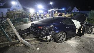 Harder Achstrasse’de genç sürücünün kullandığı lüks araç kontrolden çıkarak garaja ve sokak lambasına çarptı. Kazada dört kişi yaralandı.