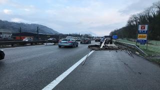 Koblach (Feldkirch bölgesi) yakınlarındaki Rheintalautobahn'da (A14) Salı sabahı ahşap yüklü bir nakliye aracının römorku devrildi. Polisin bildirdiğine göre, yüklü tahta çıta ve paneller yol üzerine yayıldı.