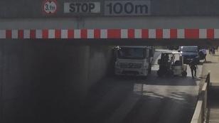 Hard Erlachstrasse'de bir kamyon, altından geçmek istediği köprüye çarptı.