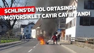 Yolda giderken tutuşan motorsiklet, yol ortasında yandı.