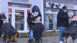 Almanya’nın Aşağı Saksonya eyaletine bağlı Delmenhorst kentinde koronavirüs nedeniyle berberlerin kapatılmasının ardından kuaför işletmecileri tıraş olmak isteyen vatandaşlara açık havada hizmet vermeye başladı.