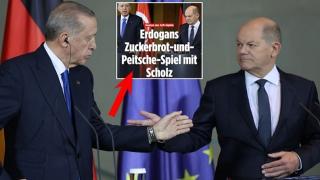 Cumhurbaşkanı Erdoğan'ın Almanya Başbakanı Olaf Scholz ile düzenlediği ortak basın toplantısındaki sözleri büyük yankı uyandırdı. Alman Bild gazetesi konuya manşetinden yer verirken "Erdoğan'ın Scholz'la havuç-sopa oyunu" ifadelerini kullandı.